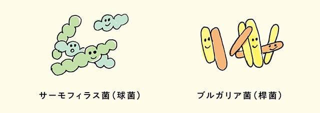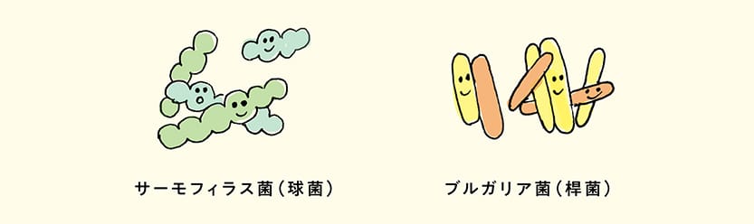 生育の早いサーモフィラス菌は、増殖の過程でブルガリア菌の生育に必要な蟻酸(ぎさん)をつくります。ブルガリア菌はこの蟻酸を取り込んで増殖し、同時にサーモフィラス菌の生育に必要なアミノ酸やペプチドをつくります。このように2つの菌はお互いにサポートし合いながら、よく増殖するという性質があります。